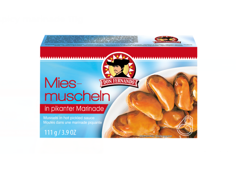 Ingredienser: MUSSLOR (Mytilus galloprovincialis) 62 %, solrosolja, vinäger, vatten, salt, stärkelse, naturlig chiliarom, naturlig arom, färgämne: paprikaextrakt; lök, kryddnejlika, peppar, lagerblad.