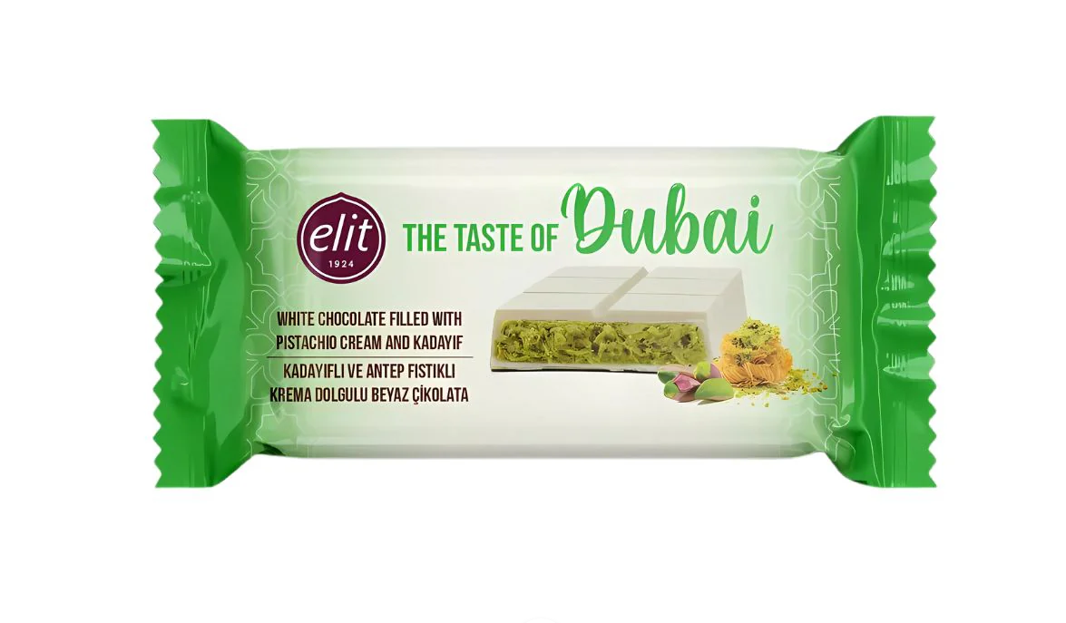 Ainesosat: valkosuklaa (60 %) (sokeri, kaakaovoi, MAITOjauhe, emulgointiaine (auringonkukkalesitiini), aromi (vanilliini)), pistaasi- ja KADAYIF-kerma (40 %) (sokeri, pistaasipähkinät (25 %), kasvirasva (palmu), KADAYIF (13 %) (VEHNÄjauho (sisältää GLUTEENIA), vesi, suola), MAITOjauhe, herajauhe (maitotuote), maltodekstriini, emulgointiaine (auringonkukkalesitiini), aromi (vanilliini)).